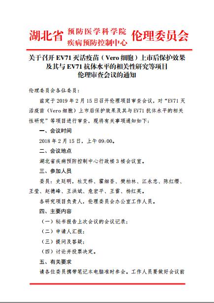 關(guān)于召開EV71滅活疫苗(Vero細(xì)胞)上市后保護(hù)效果及其與EV71抗體水平的相關(guān)性研究等項(xiàng)目倫理審查會議通知