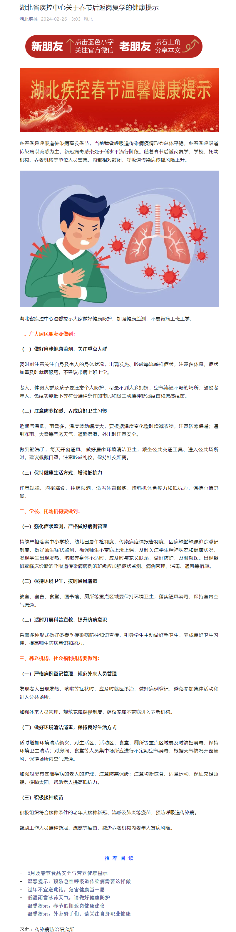 湖北省疾控中心關(guān)于春節(jié)后返崗復(fù)學(xué)的健康提示