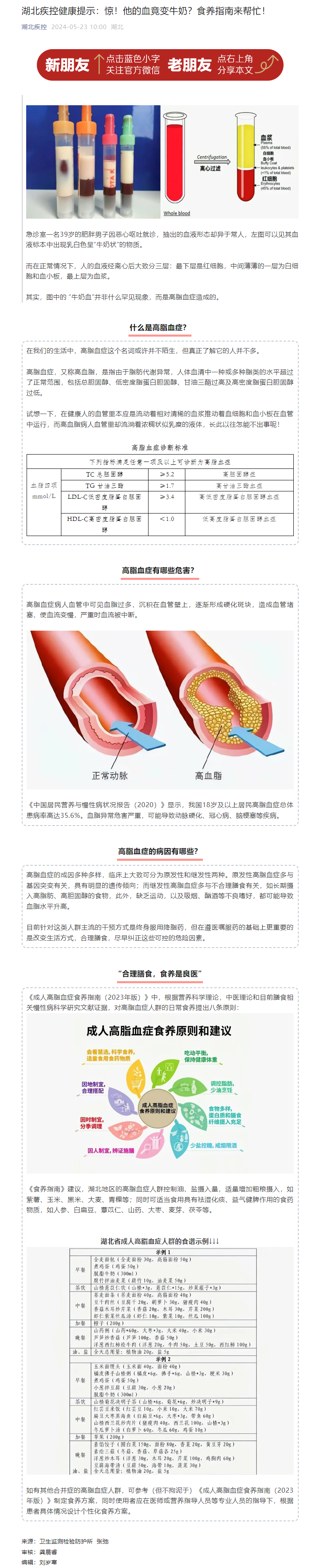 湖北疾控健康提示:驚!他的血竟變牛奶?食養(yǎng)指南來幫忙!