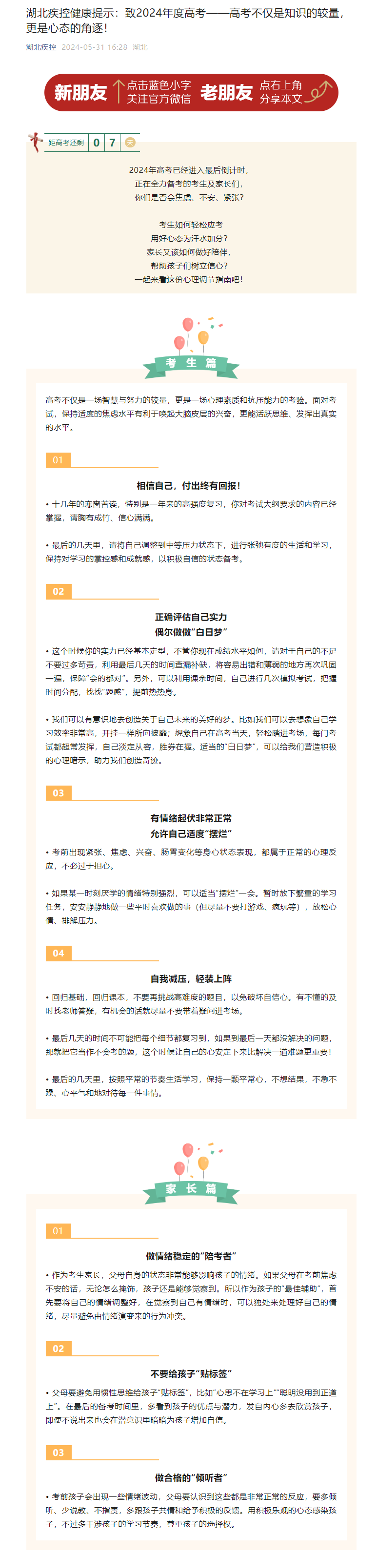 湖北疾控健康提示:致2024年度高考——高考不僅是知識(shí)的較量,更是心態(tài)的角逐!