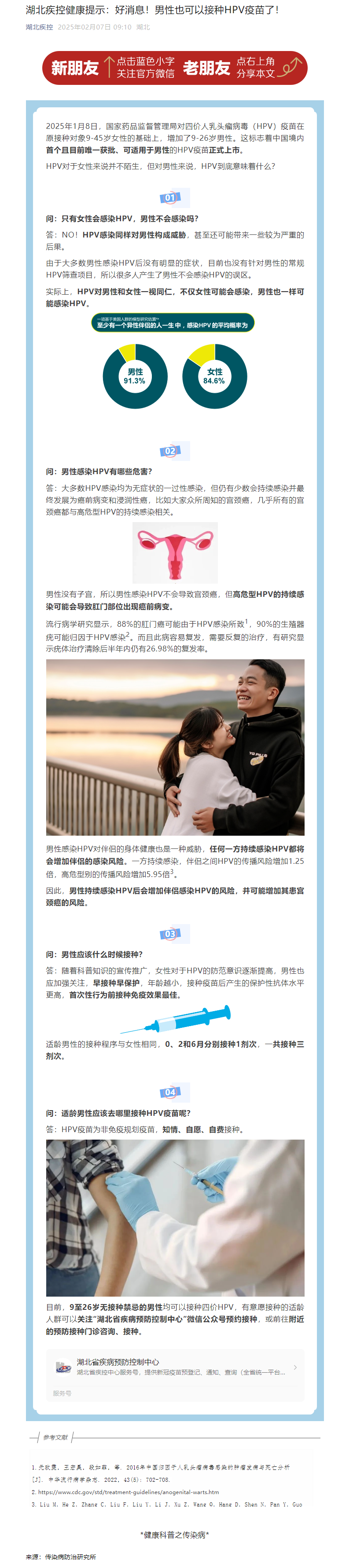 湖北疾控健康提示:好消息!男性也可以接種HPV疫苗了!