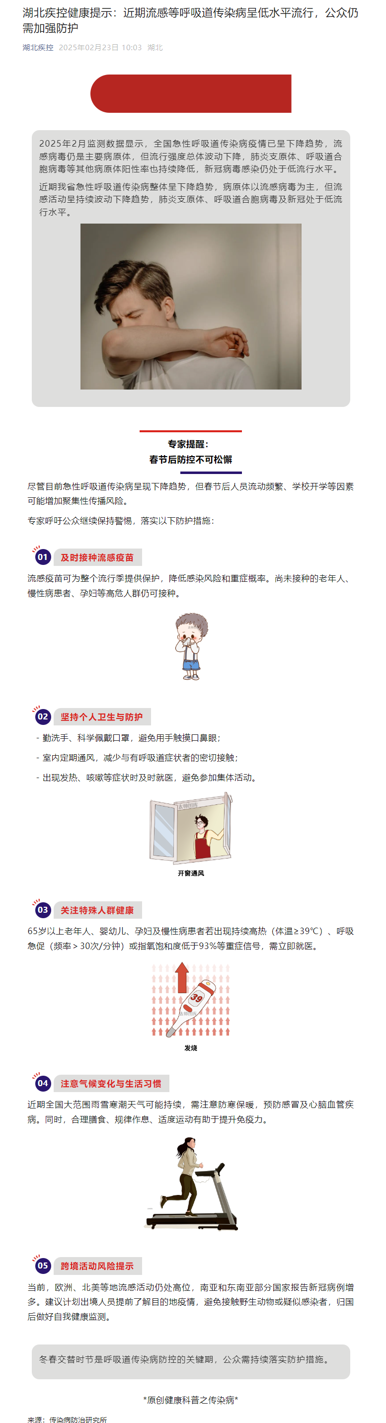 湖北疾控健康提示:近期流感等呼吸道傳染病呈低水平流行,公眾仍需加強(qiáng)防護(hù)
