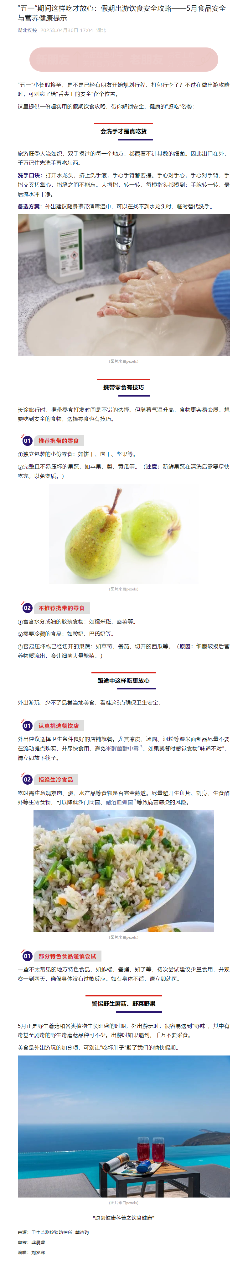 “五一”期間這樣吃才放心:假期出游飲食安全攻略——5月食品安全與營養(yǎng)健康提示