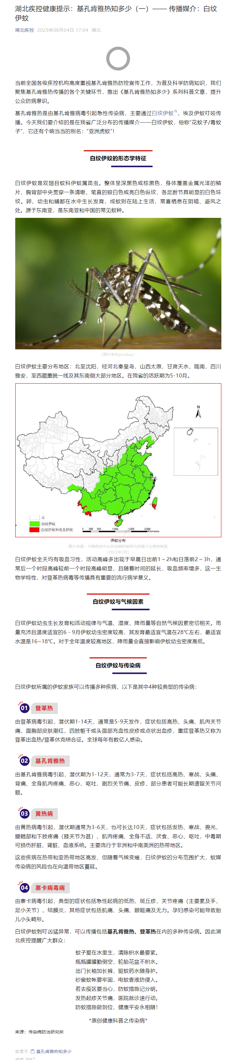 湖北疾控健康提示:基孔肯雅熱知多少(一)—— 傳播媒介:白紋伊蚊