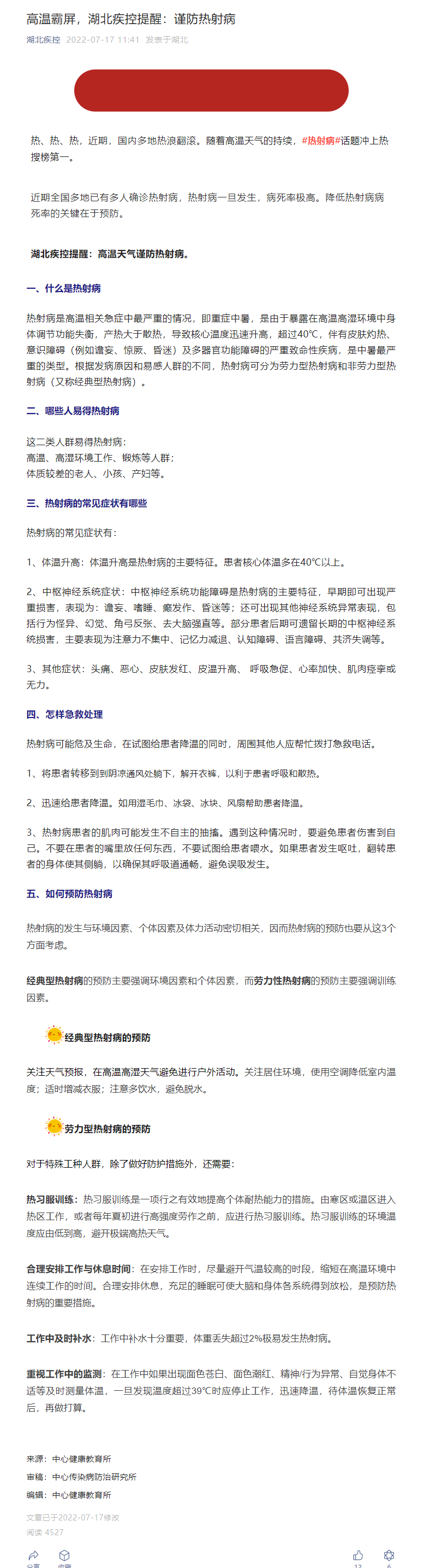 高溫霸屏,湖北疾控提醒:謹(jǐn)防熱射病