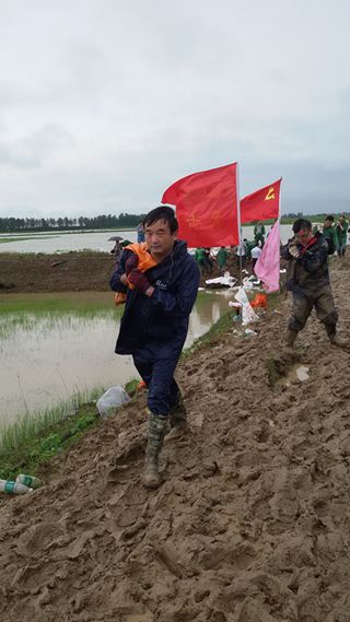 7月6日上午8時,黃梅縣疾控中心成立了以郭在清主任為隊長、7名黨員組成的黨員突擊隊,與其他突擊隊一起,乘車到達(dá)下新西隔堤下,冒著大雨,攜帶抗洪工具,在泥濘的大堤上行走十余里后,來到黃梅鎮(zhèn)張湖農(nóng)場三角湖圍堤,參與抗洪搶險。