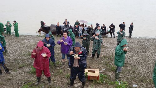 三角湖圍堤1998年曾經(jīng)決口,現(xiàn)水位已超過大堤,堤頂急需抬高,堤腳急需加固。突擊隊員腳穿雨靴,身穿雨衣,從百米外的田埂處挖土,裝進編織袋,穿過泥濘的小路和稻田,背到大堤下,對大堤底進行加固。至下午五時三十分,突擊隊近百人共計運送泥土四千余袋,成功對堤腳進行了加固,緩解了險情。