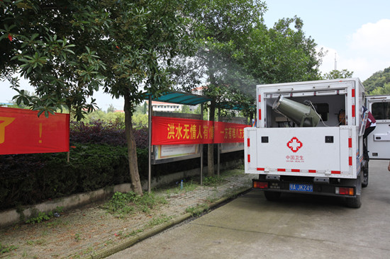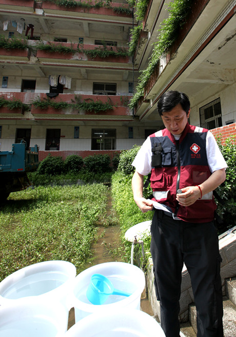 7月9日,接上級緊急命令,省疾控中心國家衛(wèi)生應(yīng)急隊迅速組織隊員10人,由占發(fā)先副院長代領(lǐng),赴蔡甸區(qū)侏儒鎮(zhèn)第四中學(xué)消泗鄉(xiāng)災(zāi)民的安置點,出動消毒防疫車、水質(zhì)檢測車、通訊保障車和指揮車4臺,與武漢市、蔡甸區(qū)疾控人員一起開展了水質(zhì)檢測、環(huán)境消殺滅等工作,并開展了防病知識宣傳。
