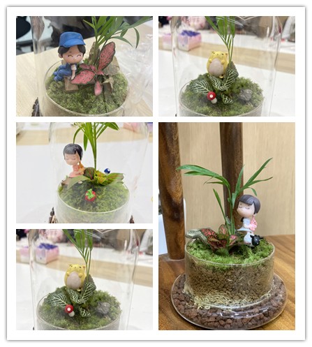 活動(dòng)開(kāi)始前,微景觀制作師首先介紹了制作所需的材料和制作技巧等知識(shí),大家聽(tīng)得聚精會(huì)神、躍躍欲試。簡(jiǎn)單教學(xué)后,大家開(kāi)始動(dòng)手制作,依次把火山石、水苔、赤玉土、苔蘚、小擺件放入圓形玻璃瓶中。待種好綠植、將土壓實(shí)、鋪上苔蘚和松皮石,最后插上一個(gè)可愛(ài)的小擺件做裝飾,一件小小的“森林世界”就組成了。制作完成后,大家紛紛表示意猶未盡、回味無(wú)窮。