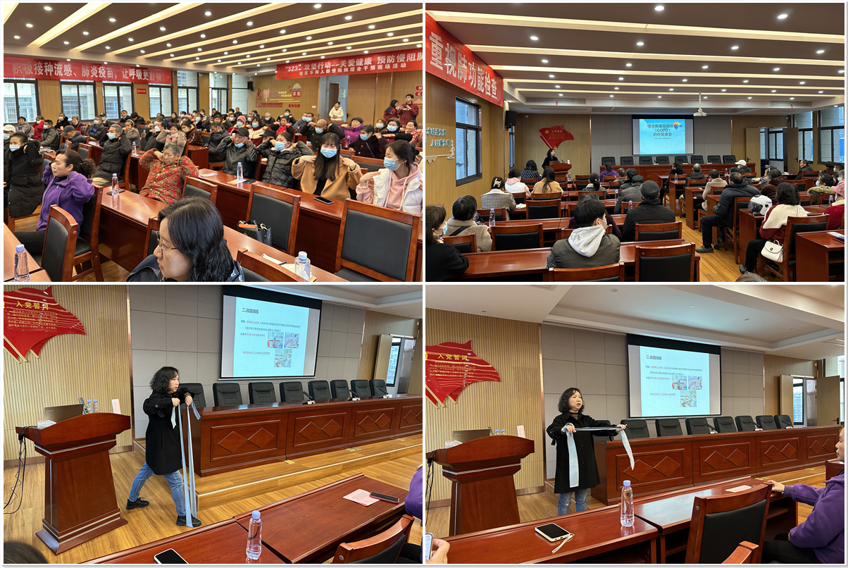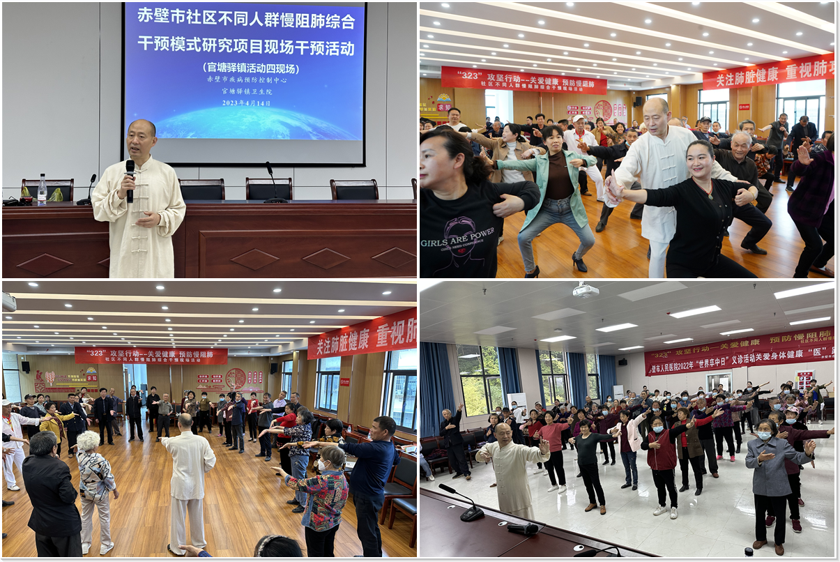 根據(jù)具體方案要求,項目組于2021年啟動項目培訓(xùn)和基線調(diào)查工作,在2022年啟動長達(dá)一年的社區(qū)干預(yù)活動。項目組分別于2022年9月28-29日、10月12-13日、2023年3月17日和4月14日在赤壁市目標(biāo)鄉(xiāng)鎮(zhèn)開展四次的面向社區(qū)居民的現(xiàn)場干預(yù)活動。第一期和第二期的干預(yù)活動邀請到咸寧市中心醫(yī)院呼吸與危重癥醫(yī)學(xué)科主任醫(yī)師徐旭燕,對什么是慢阻肺、慢阻肺患者的預(yù)防和管理、慢阻肺患者的家居環(huán)境要求、慢阻肺患者的心理健康和慢阻肺的藥物治療、慢阻肺急性加重的識別與處置、吸入性裝置的正確使用等方面進行了詳細(xì)的講解。接著由赤壁市衛(wèi)健局公共衛(wèi)生總師、赤壁市疾控中心副主任趙安平講解《接種流感疫苗、肺炎疫苗與預(yù)防慢阻肺疾病的重要性》。第三期干預(yù)活動邀請到武漢市一醫(yī)院呼吸內(nèi)科主任黃燕玲,圍繞慢性阻塞性肺疾?。?/span>COPD)的呼吸康復(fù)等方面展開培訓(xùn)和授課,親自為受眾示范縮唇呼吸、腹式呼吸、排痰法及呼吸體操等技能操作。第四期干預(yù)活動邀請到武漢體育學(xué)院雷斌教授現(xiàn)場進行了健身氣功八段錦教學(xué),從八段錦的八套動作進行耐心細(xì)致的講解并反復(fù)示范,現(xiàn)場糾正受眾的不規(guī)范動作。通過2個多小時的反復(fù)練習(xí),社區(qū)居民的積極性和參與度都很高,達(dá)到了很好的培訓(xùn)效果。每期干預(yù)活動之前還會播放簡短戒煙宣教視頻,進一步提高了干預(yù)對象戒煙意識以及掌握戒煙技巧等。在活動現(xiàn)場,工作人員為干預(yù)對象們發(fā)放了6種慢阻肺防治相關(guān)內(nèi)容的宣傳折頁共計600余份,并為參加活動的干預(yù)對象發(fā)放了一份精美的健康產(chǎn)品。該試點項目目前處于終線調(diào)查收尾階段,將于本月完成所有現(xiàn)場任務(wù)。