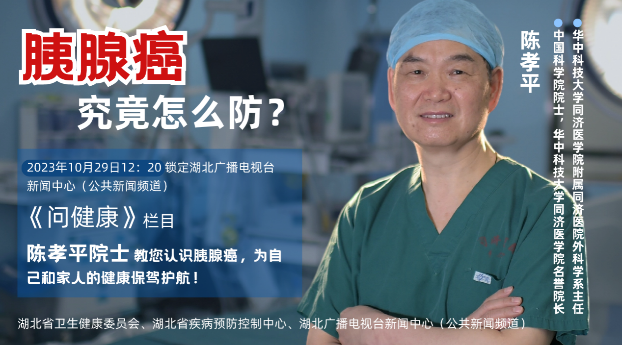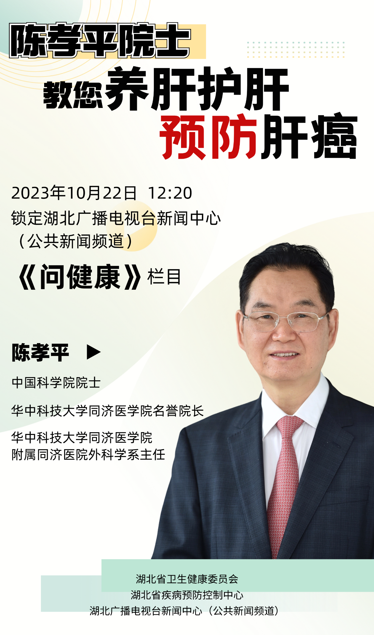 2023年10月8日,在湖北省疾病預(yù)防控制中心黨委書記朱洪波陪同下,中國(guó)科學(xué)院院士、華中科技大學(xué)同濟(jì)醫(yī)學(xué)院名譽(yù)院長(zhǎng)、華中科技大學(xué)同濟(jì)醫(yī)學(xué)院附屬同濟(jì)醫(yī)院外科學(xué)系主任陳孝平,來到湖北廣播電視臺(tái)新聞中心,出鏡電視科普欄目《問健康》,為觀眾解讀肝癌、胰腺癌防治知識(shí)。