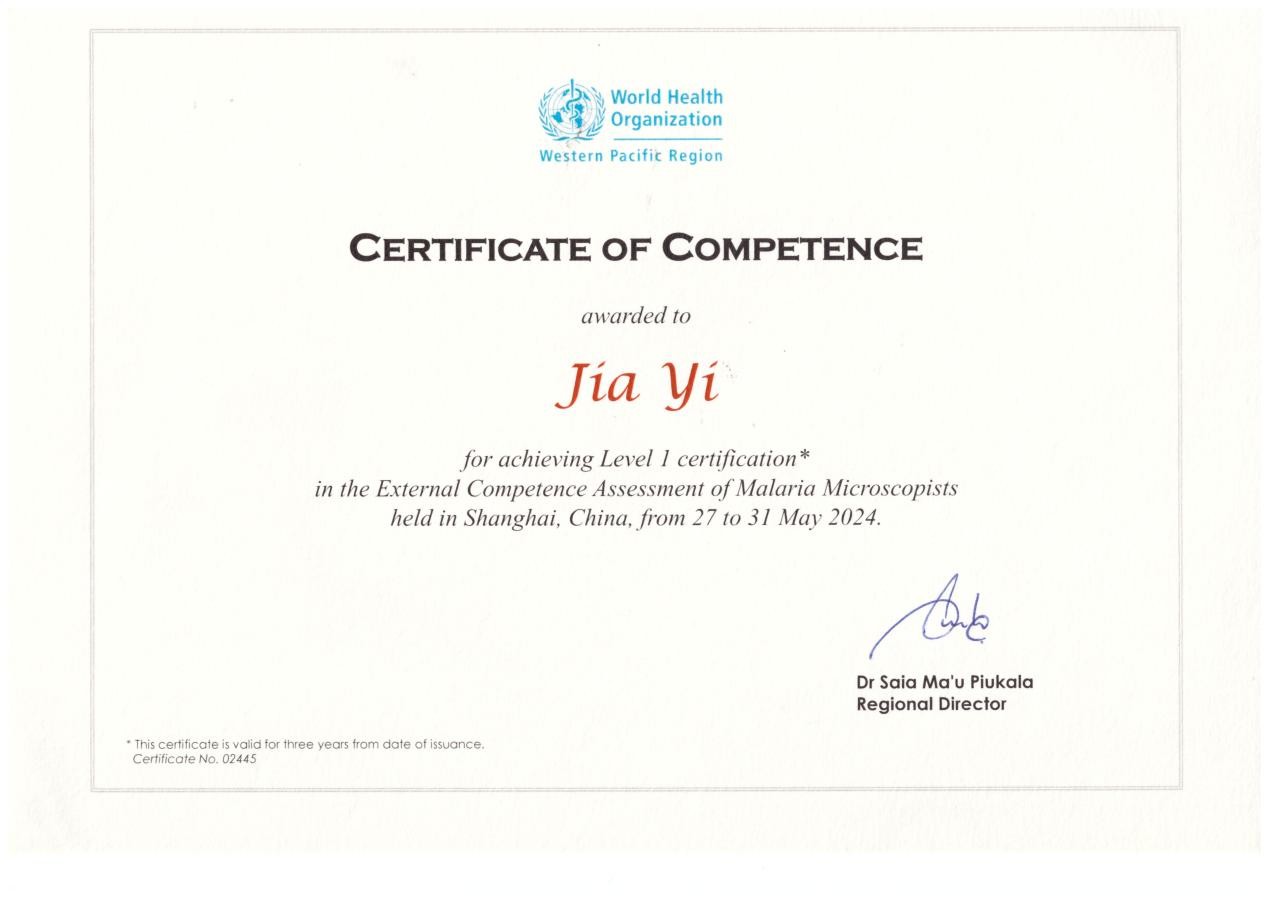 2024年5月27日-31日,世界衛(wèi)生組織(WHO)在上海對中國瘧疾鏡檢專家進行的能力評估認證。血吸蟲病防治研究所的易佳同志作為中國選派的12名鏡檢專家之一,進行了為期5天的考核評估,并以優(yōu)異成績榮獲WHO瘧疾鏡檢能力一級水平認可,取得WHO瘧疾鏡檢能力一級最高資質資格。一級水平證書在全球范圍內(nèi)認可通用,目前我省是首次獲得一級水平證書。
