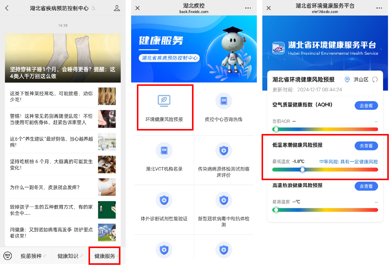 公眾打開湖北省低溫健康風(fēng)險(xiǎn)預(yù)防發(fā)布平臺查詢方式如下:關(guān)注“湖北省疾病預(yù)防控制中心”微信公眾號,點(diǎn)擊右下角的“健康服務(wù)”,在新頁面中選擇“環(huán)境健康風(fēng)險(xiǎn)預(yù)報(bào)”,在三個(gè)功能模塊中選擇“低溫寒潮健康風(fēng)險(xiǎn)預(yù)報(bào)”,具體操作如下圖所示。
