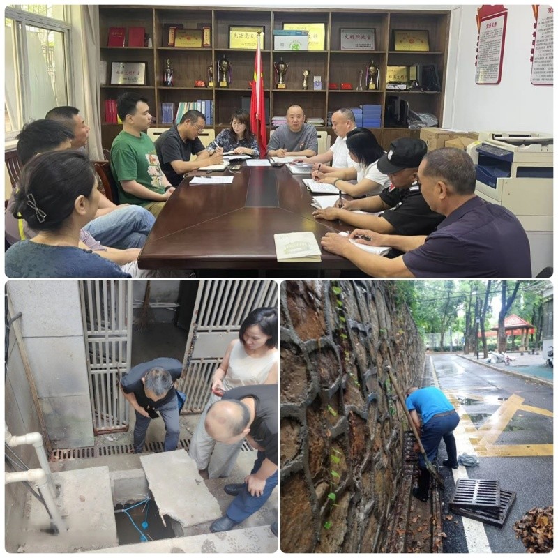 面對(duì)雨情考驗(yàn),總務(wù)后勤處與物業(yè)團(tuán)隊(duì)展現(xiàn)高效應(yīng)對(duì)。在屋頂平臺(tái),工作人員頂風(fēng)冒雨排查積水,憑借豐富經(jīng)驗(yàn)精準(zhǔn)定位滲漏隱患。排水管道疏通是重點(diǎn)任務(wù),尤其在綠植密集區(qū)域,員工徒手清理堵塞渠口的落葉雜物——有人俯身掏挖障礙,有人直接伸手探入渾濁積水中,確保關(guān)鍵排水路徑暢通無(wú)阻。