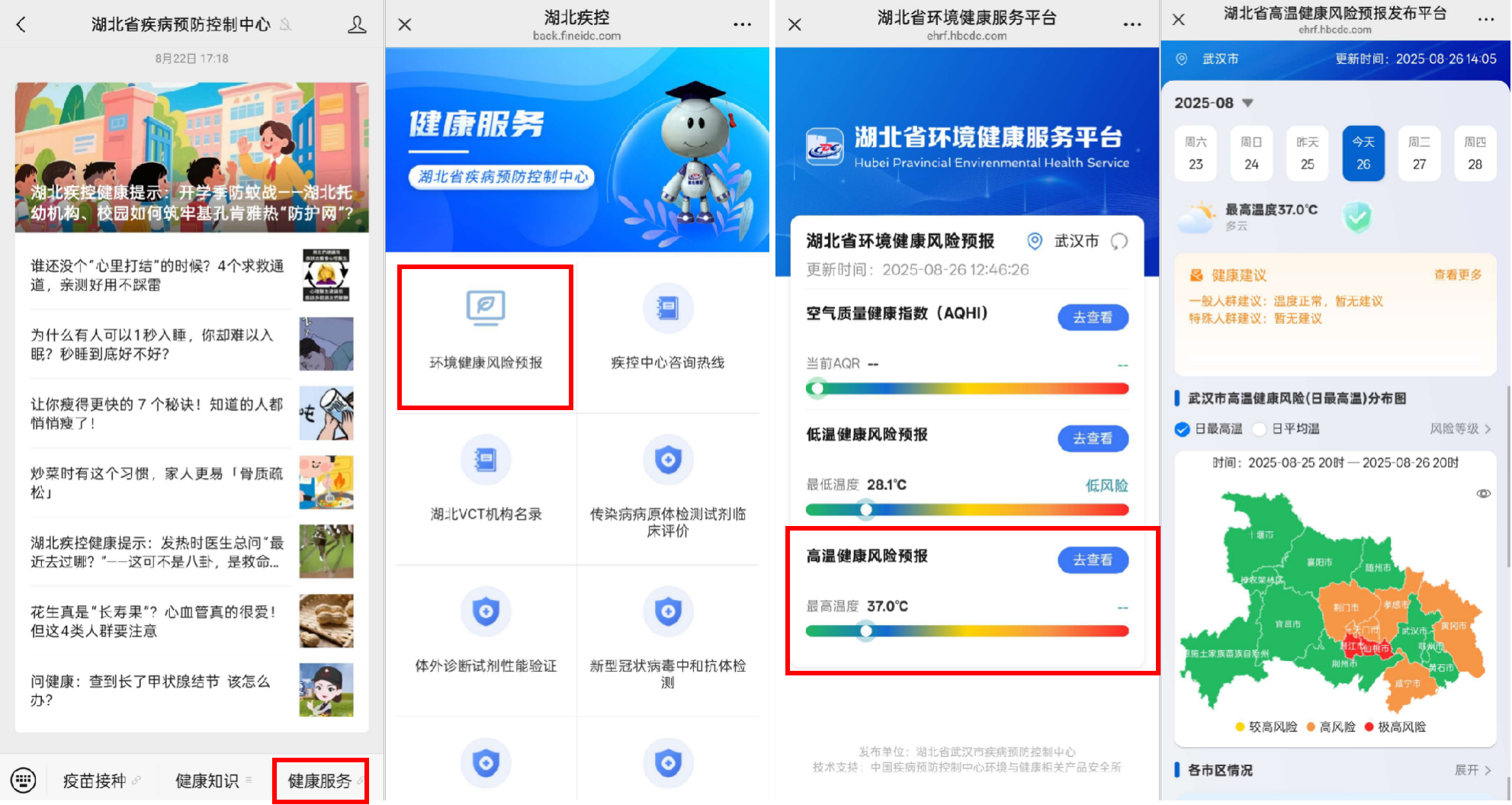 8月25日,湖北省衛(wèi)生健康委員會、湖北省氣象局及湖北省疾病預(yù)防控制局三部門聯(lián)合發(fā)布了“高溫健康風(fēng)險預(yù)警及健康提示”;與此同時,湖北省環(huán)境健康服務(wù)平臺高溫健康風(fēng)險預(yù)報功能在湖北省疾病預(yù)防控制中心官方微信公眾號正式上線。
